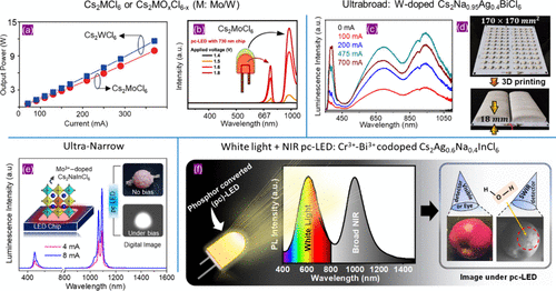 Figure 8. (a) Output power for NIR emission with a peak at ∼980 nm as a function of applied current for a Cs2MCl6 (M = Mo/W) based pc-LED panel. The phosphor was coated with UV chips. Reproduced with permission from ref (34). Copyright 2022 Wiley. (b) Luminescence spectra as a function of biased voltages for a pc-LED fabricated by coating Cs2MoCl6 phosphor composite on a far-red (730 nm) LED chip. Reproduced with permission from ref (42). Copyright 2024 American Chemical Society. (c) Luminescence spectra of 2.5% W-doped Cs2Na0.95Ag0.4BiCl6 NIR pc-LEDs at different driving currents. (d) The composite 2.5% W-doped Cs2Na0.95Ag0.4BiCl6 and poly(lactic acid) forming a 3D printed structure over the UV-LED panel. The 3D printed phosphor composites yield better thermal stability for the prolonged operation of the NIR-pc-LED. (c, d) Reproduced with permission from ref (49). Copyright 2025 Wiley. (e) Luminescence spectra of the pc-LED fabricated by coating a polymer composite of 3.8% Mo3+-doped Cs2NaInCl6 on a blue LED chip. The schematics of fabrication and digital photographs of the devices are shown in the insets. Reproduced with permission from ref (20). Copyright 2025 Wiley. (f) pc-LED panel and NIR imaging for food freshness detection using 2% Cr3+-0.5%Bi3+-codoped Cs2Ag0.6Na0.4InCl6. Images of a pair of apples were collected by a visible camera and NIR camera under illumination from pc-LED. The NIR image could detect the early rotting stage of an apple, as shown with a red circle. Reproduced with permission from ref (79). Copyright 2023 Wiley.