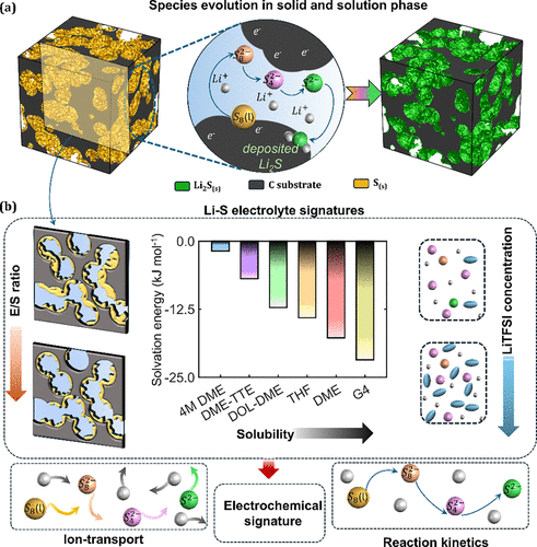 Figure 1. (a) During the Li–S discharge process, species evolution occurs within both the cathode microstructure and the electrolyte. S8(s) first dissolves into the electrolyte, followed by a multi-step electrochemical reduction at the cathode, ultimately leading to the precipitation of solid Li2S. (b) Electrolyte properties influence reaction kinetics, dissolution–precipitation behavior, and species transport in Li–S batteries. Variations in the electrolyte-to-sulfur (E/S) ratio, solvation strength, and LiTFSI concentration modify ion transport and electrochemical reaction pathways, collectively defining the electrolyte signatures governing Li–S performance. Solvation free energies are adapted from Kim et al. (37)