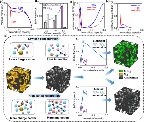 Figure 2. Simulation results illustrating the effect of the salt concentration on the Li–S cell behavior. (a) Electrochemical performance of a Li–S cell at varying salt concentrations in the electrolyte, evaluated with 80% cathode porosity and 20 vol % sulfur loading. (b) Sulfur fractions of unconverted S42– species and precipitated Li2S in the cathode at different salt concentrations. (c) Evolution of ionic conductivity during discharge for different salt concentrations, where the conductivity is normalized by the maximum ionic conductivity observed during discharge. (d) Electrolyte potential drop during discharge at different salt concentrations. (e) Evolution of PSs during discharge for different salt concentrations.