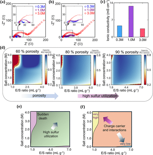 Figure 3. Nyquist plots of Li–S cells with electrolytes at different LiTFSI concentrations (a) before and (b) after discharge. (c) Experimental ionic conductivity measurement of electrolytes at different LiTFSI concentrations. (d) Simulated sulfur utilization maps as a function of the electrolyte-to-sulfur (E/S) ratio and salt concentration for pristine cathodes with different porosities (60–90 vol %). (e) Map of the salt concentration versus E/S ratio highlighting regions of high sulfur utilization and the “sudden death” zone. (f) Variation in the number of charge carriers and their interactions with changes in the salt concentration and E/S ratio.