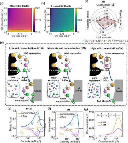 Figure 4. (a) Reversible shuttle and (b) irreversible shuttle behavior as functions of the salt concentration and E/S ratio. (c) Key performance descriptors of a Li–S battery and their dependence on the salt concentration. (d) Shuttle influx and consumption at the anode varies with the salt concentration, correlating with transport resistance. Shuttle influx and consumption calculated for (e) 0.1 M and (f) 1.0 M salt concentrations. (g) Variation of irreversible chemical redox reactions with the initial salt concentration.
