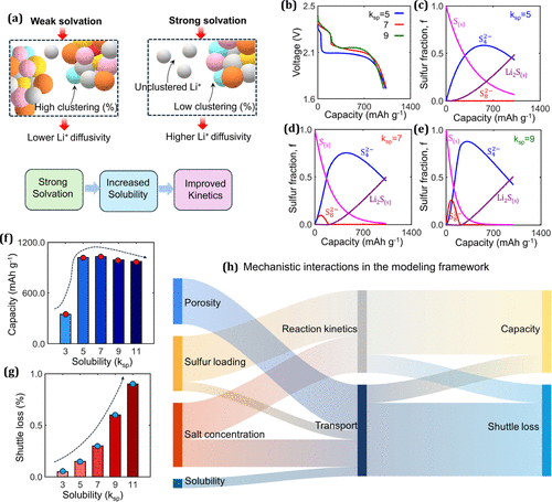Figure 5. (a) Schematic representation depicting the correlation of solvation with Li+ diffusivity; stronger solvation enhances solubility, thereby improving reaction kinetics. (b) Electrochemical performance of the Li–S cell for different ksp values. Species evolution during discharge for electrolytes with (c) ksp = 5, (d) ksp = 7, and (e) ksp = 9. (f) Discharge capacity as a function of solubility (ksp). (g) Sulfur loss due to the shuttle effect as a function of ksp. (h) Qualitative Sankey diagram illustrating the interdependencies and multivariate impact of the cathode architecture, electrolyte properties, and solubility on the mechanistic response of Li–S batteries, including transport, reaction kinetics, capacity, and shuttle loss.
