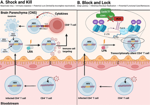 Figure 3. Contrasting Paradigms of HIV Latency Management: LRAs (″Shock and Kill″) versus LPAs (″Block and Lock″). Illustration of two distinct therapeutic strategies for managing HIV latency. (A) (″Shock and Kill″) depicts a latently infected CD4+ T-cell undergoing viral reactivation upon receiving an LRA signal. Following reactivation, an immune effector cell (specifically, a CD8+ T-cell) recognizes and targets the infected cell, inducing apoptosis and clearance. (B) (″Block and Lock″) illustrates an alternative strategy, where a latently infected CD4+ T-cell receives a latency-promoting agent (LPA) signal, reinforcing transcriptional silencing. This mechanism highlights the inhibitory action of the compound didehydro-cortistatin A (dCA) on critical HIV transcription elongation factors, including Tat, CDK9, and Cyclin T1, thereby maintaining durable latency without inducing viral production. LRA: latency reversal agent, LPA: latency promoting agent, BRD4: Bromodomain 4, MHC: Major histocompatibility class I, TCR: T cell receptor, PKC: Protein Kinase C, HDAC: Histone Deacetylase Inhibitor, dCA: didehydro-cortistatin A, CDK9: Cyclin-dependent kinase 9, Ac: Acetyl group. Created with BioRender.com.