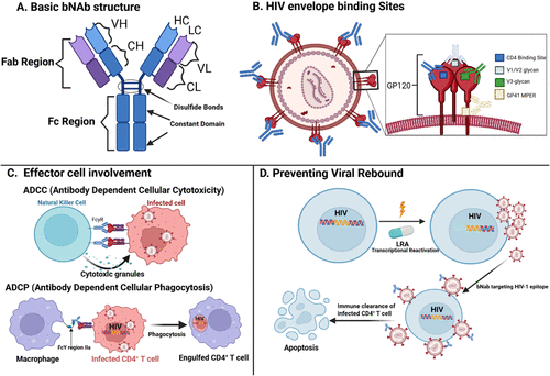 Figure 4. Broadly Neutralizing Antibodies (bNAbs) and Control of HIV Viral Rebound. (A) Schematic representation of a bNAb, highlighting key structural components including the variable region, fragment antigen-binding (Fab) region, and fragment crystallizable (Fc) region. (B) Illustration of the HIV envelope glycoproteins gp120 and gp41, with specific epitopes targeted by individual bNAbs. These epitopes include regions within the variable loops (V2, V3), glycan-dependent sites, and the membrane-proximal external region (MPER). (C) Immune effector cells involved in antibody-mediated clearance mechanisms, specifically antibody-dependent cellular cytotoxicity (ADCC) and antibody-dependent cellular phagocytosis (ADCP), demonstrate how bNAbs facilitate immune recognition and subsequent elimination of HIV-infected cells. (D) Schematic showing bNAb’s binding to HIV-1 virions following transcriptional reactivation of integrated, previously latent provirus in CD4+ T-cells. LRA: Latency reversal agent, LPA: Latency promoting agent, bNAb: Broadly neutralizing antibody, ADCC: Antibody-dependent cellular cytotoxicity, ADCP: Antibody-dependent cellular phagocytosis, VH: Variable Heavy, VL: Variable Light, CH: Constant Heavy, CL: Constant Light, Fab: Fragment antigen binding domain, FcyR: Fc-γ receptor, GP120: Glycoprotein 120. Created with BioRender.com.