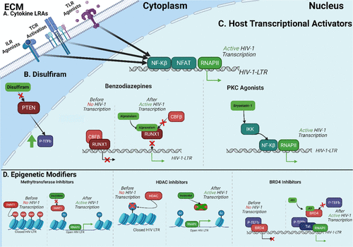 Figure 5. Overview of HIV Latency Reversal Agents. (A) Cytokine reactivation of HIV transcription is generally mediated through increased NF-kB and NFAT binding of the LTR, recruiting RNAPII. (B) Disulfiram can block PTEN/AKT signaling by inhibiting phosphatase, removing phosphate from PIP3. This increases P-TEFb, which mediates Tat-dependent HIV transcription. (C) LRAs can activate host-mediated transcription of HIV. PKC agonists increase NF-kB activity by enhancing its binding to the LTR. Benzodiazepines disrupt CBFβ binding to RUNX1, increasing transcription. (D) BRD4 inhibitor competitively block the binding of P-TEFb to BRD4, allowing P-TEFb to bind with Tat and complete Tat-dependent transcription. Methyltransferase inhibitors block the addition of methyl groups, leading to a more transcriptionally active epigenetic environment. HDAC inhibitors block histone deacetylation, leading to a more transcriptionally active epigenetic environment. ECM: Extracellular matrix, DMNT1: DNA methyltransferase 1, HDAC: Histone Deacetylase, RNAPII: RNA Polymerase II, NFAT: Nuclear Factor of Activated T-cells, NF-kB: Nuclear factor-kappa B, IKK: I kappa B kinase, P-TEFb: Positive Transcription Elongation Factor b, BRD4: Bromodomain-containing protein 4. Created with BioRender.com.