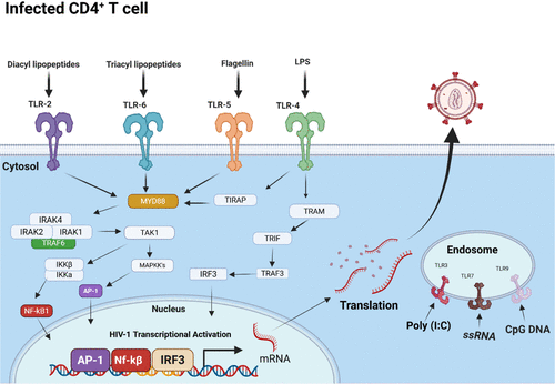 Figure 6. TLR-mediated HIV Latency Reversal. A schematic illustration of the Toll-like receptors (TLRs) involved in HIV latency reversal in latently infected CD4+ T-cells. TLRs 2, 4, 5, and 6 are depicted on the cellular surface, whereas TLRs 3, 7, and 9 are localized within endosomal compartments. Pathogen-associated molecular patterns (PAMPs), including microbial and viral motifs, interact with these TLRs, initiating intracellular signaling cascades. Activation of these pathways leads to nuclear translocation of transcription factors such as AP-1, NF-κB, and IRF3, facilitating their binding to the HIV 5′ LTR region and resulting in transcriptional reactivation of latent HIV. TLR: Toll-Like Receptor, NF-kB: NF-Kappa β, LPS: Lipopolysaccharide. Created with BioRender.com.