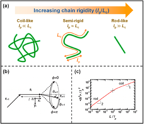 Figure 2. (a) Chain conformation for coil-like, semirigid, and rod-like polymers. Chain rigidity increases with an increased ratio of the chain persistence length (lp) to the contour length (Lc). Reproduced with permission from ref (28) and modified. Copyright 2022 American Chemical Society. (b) Depiction of hindered rotation model (ri: backbone displacement vectors, θi: deflection angles, ϕi: dihedral angles). Reproduced with permission from ref (25). Copyright 2014 American Chemical Society. (c) The correlation between the end-to-end distance squared normalized by the persistence length squared (⟨h2⟩/lp2) and the persistence length per chain (L/lp) in the freely rotating worm-like chain model. Reproduced with permission from ref (31). Copyright 2017 Royal Society of Chemistry.