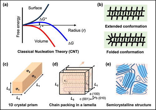 Figure 3. (a) Diagram of free energy change with increased nucleus radius based on classical nucleation theory (CNT). Reproduced with permission from ref (60) and modified. Copyright 2019 American Chemical Society. (b) Schematic of the P3HT chain conformation from extended to folded with increased molecular weight. Reproduced with permission from ref (66) and modified. Copyright 2009 American Chemical Society. (c, d) Schematic of (c) a 1D crystal prism model and (d) the possible chain packing in a P3HT lamella. Reproduced with permission from ref (70) and modified. Copyright 2010 Elsevier. (e) Schematic of coexisting ordered crystalline regions and disordered amorphous regions in conjugated polymer thin films. Reproduced with permission from ref (12) and modified. Copyright 2013 Nature Publishing Group.