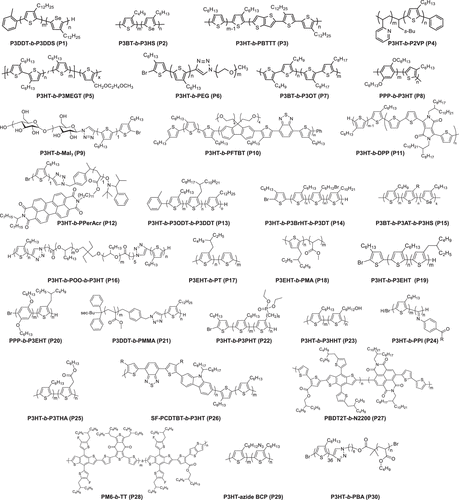 Within conjugated BCPs, the interplay and competition between crystallization and microphase separation can be tailored by backbone and side chain engineering (e.g., molecular weight (MW), regioregularity (RR), block ratio, backbone structure, block sequence, alkyl side chain, and side chain functionalization) and extrinsic film-processing factors (e.g., processing solvent, film-forming method, and post-treatment thermal and solvent vapor annealing), either solely or in combination. In the following, we illustrate how these parameters influence their microphase separation and crystallization, mainly focusing on P3AT-based BCPs. Selected molecular structures of conjugated BCPs are given for clarity (Figure 5).