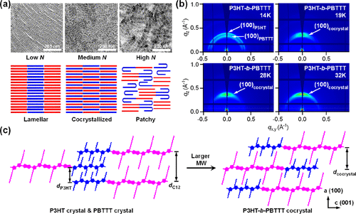 Figure 6. (a) TEM images and the schematic of the annealed P3DDT-b-P3DDS thin films with the increased polymerization degree N. Reproduced with permission from ref (17). Copyright 2019 American Chemical Society. (b) 2D-GIWAXS images and (c) corresponding chain packing in drop-cast P3HT-b-PBTTT thin films with various molecular weights. Reproduced with permission from ref (112). Copyright 2024 American Chemical Society.