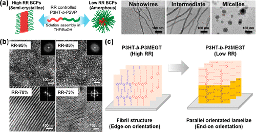 Figure 7. (a) Schematic and TEM images of P3HT-b-P2VP in the solution influenced by the RR of P3HT, demonstrating the morphology transformation from nanowires to micelles with the decreased RR. Reproduced with permission from ref (116). Copyright 2018 American Chemical Society. (b) TEM images of P3HT-b-P2VP with different contents of P3HT and RR values in the solid state. Reproduced with permission from ref (118). Copyright 2017 American Chemical Society. (c) Different crystalline orientations of P3HT-b-P3MEGT with high and low RR of P3HT in the solid state. Reproduced with permission from ref (120). Copyright 2022 American Chemical Society.