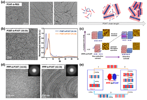 Figure 8. (a) TEM images of P3HT-b-PEG with the increased P3HT length when produced from an anisole solution. The schematic describes the chain packing influenced by the P3HT length or solvent. Reproduced with permission from ref (121). Copyright 2012 John Wiley and Sons. (b) TEM image of the P3BT-b-P3OT (50:50) in 1,2-dichlorobenzene and WAXD spectra of P3BT-b-P3OT (50:50 and 76:24). Reproduced with permission from ref (122) and modified. Copyright 2009 American Chemical Society. (c) Schematic of PPP-b-P3HT in various block ratios when produced from chlorobenzene and anisole, illustrating the preferential crystallization and microphase separation, respectively. Reproduced with permission from ref (123) and modified. Copyright 2016 Elsevier. (d) TEM images of PPP-b-P3HT (34:66 and 62:38) films annealed at 280 °C for 1 h, showing fibrillar morphology and microphase-separated nanoribbon morphology, respectively. Reproduced with permission from ref (13). Copyright 2012 American Chemical Society. (e) Three different epitaxy crystallization modes achieved in PPP-b-P3HT films during thermal annealing at different temperatures. Reproduced with permission from ref (124) and modified. Copyright 2015 American Chemical Society.