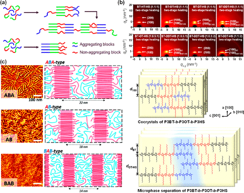 Figure 10. (a) Schematic of the solution aggregation behavior of P3AT-based triblock copolymers dependent on the block sequence. Reproduced with permission from ref (132). Copyright 2018 American Chemical Society. (b) 2D-GIWAXS images of P3BT-b-P3AT-b-P3HS triblock copolymer thin films after two-stage heating process, and the schematic of chain packing in cocrystals and microphase-separated structures represented by P3BT-b-P3OT-b-P3HS. Reproduced with permission from ref (134). Copyright 2022 Elsevier. (c) AFM images and the corresponding schematic of ABA-type, AB-type, and BAB-type (block A: P3HT, block B: POO) in the annealed thin films. Reproduced with permission from ref (135). Copyright 2019 Royal Society of Chemistry.