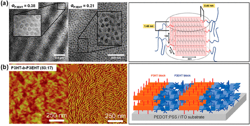 Figure 11. (a) TEM images of cylindrical microdomains in P3EHT-b-PMA with different fractions of P3EHT by melt pressing at 150 °C, and the corresponding chain packing confined in cylinders. Reproduced with permission from ref (139). Copyright 2017 American Chemical Society. (b) AFM images of P3HT-b-P3EHT (83:17) thin films after thermal annealing and the corresponding schematic of chain packing. Reproduced with permission from ref (141). Copyright 2009 American Chemical Society.