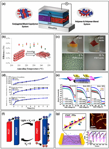 Inserting a random polymer into conjugated BCPs could also adjust the microphase separation and crystallization. By inserting a certain content of 3-octylthiophene (3OT) into the P3HT chains, the formed poly(3-hexylthiophene-2,5-diyl-random-3-octylthiophene-2,5-diyl) (P[3HT-r-3OT]) had weaker crystallization ability than P3HT. (127) Therefore, incorporating the P[3HT-r-3OT] into a D–A BCP with poly((9,9-dioctylfluorene-2,7-diyl)-alt-(4,7-di(thiophene-2-yl)-2,1,3-benzothiadiazole-5′,5″-diyl) (PFTBT) block led to greatly improved microphase separation in P[3HT-r-3OT]-b-PFTBT thin film than that in P3HT-b-PFTBT (P10, Figure 5) without the random copolymer (Figure 9c).