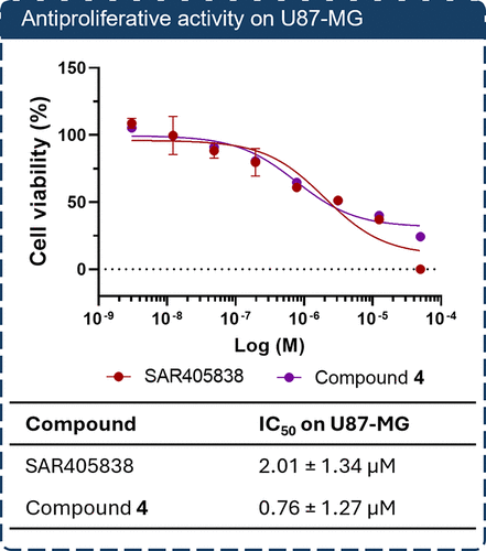 Figure 3. Antiproliferative activity of SAR405838 and compound 4 on U87-MG glioblastoma cells. Cells were treated with increasing concentrations of SAR405838 or compound 4 for 72 h, and cell viability was assessed using the CellTiter-Glo Luminescent Cell Viability Assay. Data represent mean ± SD of three technical replicates from one representative experiment out of at least three independent experiments, all yielding consistent results. IC50 values were calculated by nonlinear regression using GraphPad Prism; reported standard deviations reflect the fitting error of the regression model.