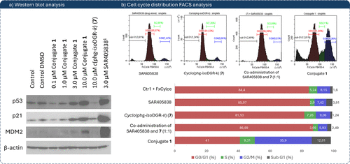 Figure 5. (a) Western blot response-dependent analysis of conjugate 1, cyclo(phg-isoDGR-k) (7), and SAR405838 on p53, p21, and MDM2 expression in U87-MG cells. Concentration of SAR405838 chosen on previously performed dose-dependent Western blot analysis. (b) Cell cycle distribution analysis in U87-MG cells treated with 10 μM of the respective compounds for 24 h. DNA content was assessed by FxCycle staining and analyzed by FACS; histograms shown represent SAR405838 (histogram 1), cyclo(phg-isoDGR-k) (7, histogram 2), 1:1 molar coadministration of 7 and SAR405838 (histogram 3), and compound 1 (histogram 4). Cell population distributions in G0/G1, S, G2/M, and sub-G1 phases are summarized in the bar graph. Full gating strategy, replicate histograms, and control conditions are available in the Supporting Information (Table S3, Figure S2).