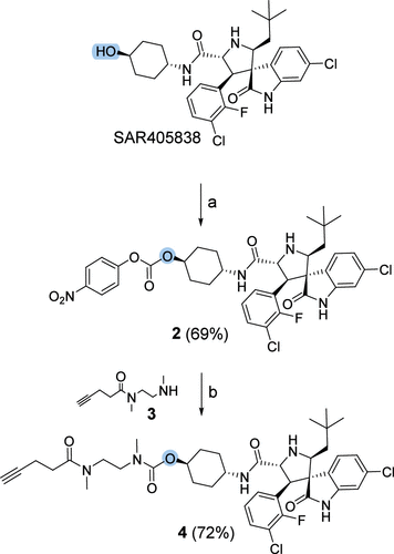 The choice of conjugation site was supported by our recent work, in which inserting a hydroxyalkyl chain at a solvent-exposed position of the β-carboline-based MDM2 inhibitor did not significantly impair the compound’s biological activity. (47) To functionalize the selected hydroxyl group, we chose an N-methyl ethylenediamine–pentynoic acid linker (4) with a terminal alkyne for click reaction with the azide moiety and an amide-based backbone to avoid a hydrolyzable ester bond in the final conjugate. As outlined in Scheme 1, the secondary hydroxyl group of SAR405838 was first activated by conversion to the corresponding p-nitrophenyl carbonate 2 (69% yield). The intermediate was coupled under basic conditions with the previously synthesized alkyne linker 3, (47) affording the desired compound 4 in 72% yield. To evaluate whether linker installation affected biological activity, we tested compound 4 on U87-MG glioblastoma cells using the CellTiter-Glo luminescent cell viability assay after 72 h of incubation.
