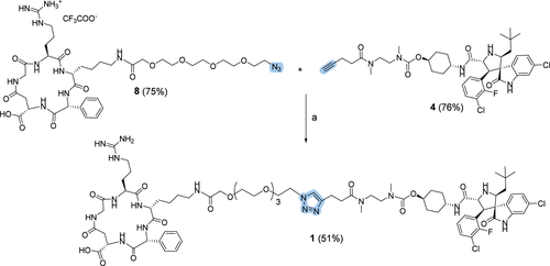 The antiproliferative activity of 4 (0.76 ± 1.27 μM) was fully comparable to that of SAR405838 (2.01 ± 1.34 μM, respectively), thus confirming the suitability of the selected conjugation site (Figure 3). The previously identified α5β1 ligand, cyclo(phg-isoDGR-k) (7), was synthesized by slightly modifying a reported protocol by Kessler et al. (43) The synthesis was initiated with the solid-phase peptide synthesis (SPPS) of Fmoc-k(Boc)-phg-isoD(t-Bu)GR(Pbf)–OH (5) using DIC/Oxyma as coupling agents. After cleavage from 2-CTC resin using 20% HFIP in DCM, macrolactamization was performed using HATU/Oxyma/DIPEA (43) under pseudodilution conditions (7.5 mM, peptide concentration), delivered via syringe pump, which afforded compound 6 in 72% yield. Obtained compound 6 was treated with cleavage cocktail TFA/EDT/TIS/water (95:2:2:1) to afford cyclo(phg-isoDGR-phg-k) (7) (Supp info, Synthesis 1.4. – 1.6.) which was then functionalized at the ε-amino group of lysine side chain with the azido-tetraethylene glycol spacer in 75% yield. The resulting intermediate 8 was subsequently coupled to compound 4 through the copper-catalyzed azide alkyne cycloaddition (CuAAC), affording the final conjugate 1 in 51% yield (Scheme 2).