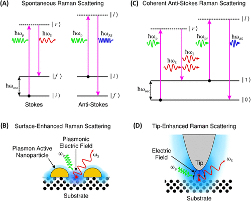 Figure 2. (A) Illustration of Stokes and anti-Stokes Raman scattering, showing energy transitions during spontaneous inelastic light scattering. (Anti-Stokes scattering is shown for completeness of the Raman process.) (B) SERS mechanism, where localized surface plasmons on metallic nanostructures enhance the EM and Raman signal. (C) Schematic of CARS, highlighting the nonlinear four-wave mixing process generating anti-Stokes emission (D) TERS, utilizing a plasmonic metallic tip to confine and enhance the EM field at the nanoscale for high-resolution Raman imaging. (Jones, R.R., Hooper, DC. Zhang, L. et al. Raman Techniques: Fundamentals and Frontiers. Nanoscale Res Lett 14, 231 (2019). 10.1186/s11671-019-3039-2). Adapted from ref (22).