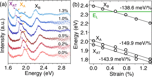 Figure 4. Differential-reflectance tracking of exciton energies under biaxial strain. (a) Normalized ΔR/R spectra showing the systematic red shift of the A and B excitons with increasing tensile biaxial strain. Purple and orange arrows indicate the A trion (XAT) and exciton (XA) positions, respectively. The background signal was subtracted from each spectrum for clarity. (b) Strain dependence of the XA, XB, and XAT energies. Linear fits yield a slope of −138.6 ± 10 meV/% for the B exciton, corresponding to a total shift of ∼−180 meV at ε = 1.3%. The green line marks the laser excitation energy (EL).