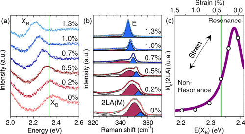 Figure 5. Strain-controlled transition between resonant and nonresonant 2LA(M) scattering. (a) B-exciton energy as a function of biaxial strain extracted from differential reflectance. The green horizontal line indicates the fixed laser excitation energy (2.33 eV). (b) Strain dependence of the E and 2LA(M) Raman modes positions. (c) Normalized intensity of the 2LA(M) as a function of B-exciton energy, showing a continuous suppression as the exciton is shifted away from resonance with the laser (green line). The upper horizontal axis indicates the corresponding biaxial strain. The purple solid line represents the effective resonance model used to quantify the detuning-dependent decay of the 2LA(M) intensity.