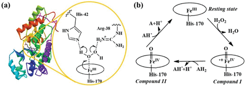 - 45Obinger C. Maj M. Nicholls P. Loewen P. Activity, Peroxide Compound Formation, and Heme d Synthesis in Escherichia coli HPII Catalase Arch. Biochem. Biophys. 1997 342 1 58 6745Activity, peroxide compound formation, and heme d synthesis in Escherichia coli HPII catalaseObinger, C.; Maj, M.; Nicholls, P.; Loewen, P.Archives of Biochemistry and Biophysics (1997), 342 (1), 58-67CODEN: ABBIA4; ISSN:0003-9861. (Academic)Wild-type Escherichia coli HPII catalase (heme d contg.) has 15% the activity of beef liver enzyme per heme. The rate const. for compd. I formation with H2O2 is 1.3×106 M-1 s-1. HPII compd. I reacts with H2O2 to form O2 with a rate const. of 1.8×106 M-1 s-1. Forty percent of HPII hemes are in the compd. I state during turnover. Compd. I is reduced by ethanol and formate at rates of 5 and 13 M-1 s-1 (pH 7.0), resp. Incubation of HPII compd. I with ferrocyanide and ascorbate does not form a compd. II species. Mutation of His128 to alanine or asparagine gives inactive protoheme proteins. Mutation of Asn-201 gives partially active heme d forms. Asn201Ala has 24%, Asn201Asp 10%, and Asn201Gln 0.4% of wild-type activity. Asn201His contains protoheme when isolated and converts this via protoheme compd. I to a heme d species. Both distal heme cavity residues His128 and Asn201 are implicated in catalytic activity, compd. I formation, and in situ heme d biosynthesis. HPII Asn201, like the corresponding residue in protoheme catalases, may promote H+ transfer to His128 imidazole, facilitating (i) peroxide anion binding to heme and (ii) stabilization of a transition state for heterolytic cleavage of the O-O bond.