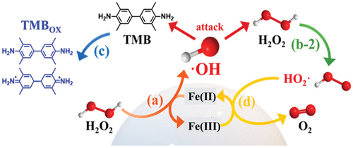 - 59Song L. N. Huang C. Zhang W. Ma M. Chen Z. W. Gu N. Zhang Y. Graphene oxide-based Fe2O3 hybrid enzyme mimetic with enhanced peroxidase and catalase-like activities Colloids Surf., A 2016 506 747 75559Graphene oxide-based Fe2O3 hybrid enzyme mimetic with enhanced peroxidase and catalase-like activitiesSong, Lina; Huang, Chao; Zhang, Wei; Ma, Ming; Chen, Zhongwen; Gu, Ning; Zhang, YuColloids and Surfaces, A: Physicochemical and Engineering Aspects (2016), 506 (), 747-755CODEN: CPEAEH; ISSN:0927-7757. (Elsevier B.V.)Graphene based materials are widely used in energy conversation and catalytic reaction due to their rapid electron transfer capacity and large surface area. Herein, graphene Fe2O3 (GO-Fe2O3) hybrids with enhanced peroxidase-like activity were fabricated. Enhanced peroxidase-like activity strongly depending on pH, temp. and hybrid concn. was obsd. and the peroxidase-like behavior fits well the Michaelis-Menten kinetic model. Free radicals, such as ·OH and O-2·, as intermediates in the hybrid-H2O2 reaction system were directly demonstrated by ESR (ESR) technique and the selective radical inhibition expts. Furthermore, it was found that the addn. of TMB rapidly consumed ·OH and O-2·, and subsequently leaded to the formation of blue TMB radical confirmed by the ESR and absorption spectroscopy. Besides acting as mimetic peroxidase in acidic buffer, the GO-Fe2O3 hybrids also displayed the enhanced catalase-like activity in neutral and alk. buffers compared with individual Fe2O3 nanoparticles and GO sheet, resp. The H2O2 decompn. catalyzed by the hybrids was demonstrated by ESR and the generated O2 was measured using the dissolved oxygen electrode. All the results above demonstrate that the GO-Fe2O3 hybrids are a kind of effective pH-dependent mimetic dual-enzyme.
