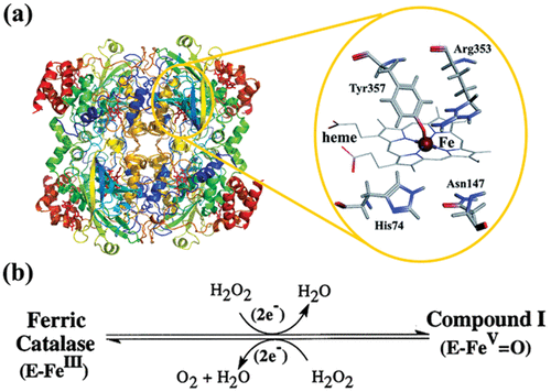 - 44Fita I. Rossmann M. G. The active center of catalase J. Mol. Biol. 1985 185 1 21 3744The active center of catalaseFita, Ignacio; Rossmann, Michael G.Journal of Molecular Biology (1985), 185 (1), 21-37CODEN: JMOBAK; ISSN:0022-2836.The refined structure of beef liver catalase is examd. with regard to possible catalytic mechanisms. The distal side of the deeply buried heme pocket is connected with the surface of the mol. by 1 (or possibly 2) channel(s). The electron d. representing the heme group, in each of the 2 crystallog. independent subunits, is consistent with degrdn. of the porphyrin rings. The heme group appears to be buckled, reflecting the high content of bile pigment in liver catalase. The spatial organization on the proximal side (where the 5th ligand of the Fe is located) shows an elaborate network of interactions; the distal side contains the substrate pocket. The limited space in this region severely constrains possible substrate positions and orientations. The Nδ atom of essential histidine-74 H bonds with Oγ of serine-13, which in turn H bonds to an H2O mol. assocd. with the propionic carbonylic group of pyrrole III. These interactions are also visible in the refined structure of Penicillium vitale catalase. Model building suggests a pathway for a catalase mechanism (compd. I formation, as well as catalase and peroxidase reactions). There are some similarities in compd. I formation of catalase and cytochrome c peroxidase.