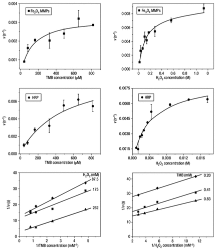 | His-Fe3O4 | Peroxidase | H2O2 | 37.99 | 5.28×10-9 | 5.39×105 | ( 31) |