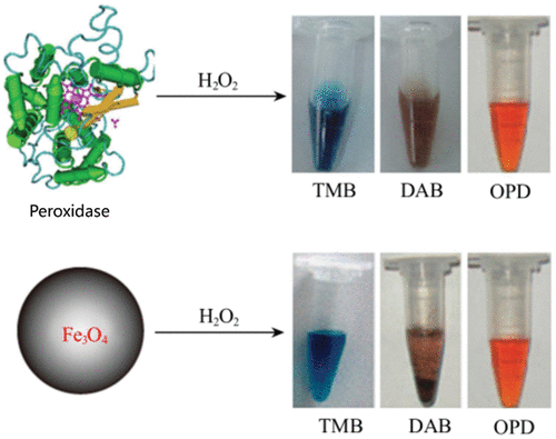 | Fe3O4 | Peroxidase | TMB | 0.374 | 2.6×10-8 | / | ( 62) |