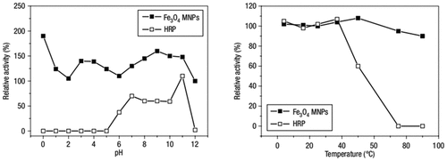 - 127Zhang X.-Q. Gong S.-W. Zhang Y. Yang T. Wang C.-Y. Gu N. Prussian blue modified iron oxide magnetic nanoparticles and their high peroxidase-like activity J. Mater. Chem. 2010 20 24 5110 5116127Prussian blue modified iron oxide magnetic nanoparticles and their high peroxidase-like activityZhang, Xiao-Qing; Gong, Shang-Wenyan; Zhang, Yu; Yang, Ting; Wang, Chun-Yu; Gu, NingJournal of Materials Chemistry (2010), 20 (24), 5110-5116CODEN: JMACEP; ISSN:0959-9428. (Royal Society of Chemistry)Prussian blue (PB) modified γ-Fe2O3 magnetic nanoparticles (MNPs) featuring varying PB proportions were synthesized and characterized by TEM, FTIR, UV-vis, EDS, XRD and XPS. The magnetic properties and peroxidase-like catalytic activity of the synthesized nanoparticles were investigated. With increasing PB content, the magnetism could still maintain a high level. Peroxidase-like activity was enhanced as the PB proportion increased. Catalysis was found to follow Michaelis-Menten kinetics. The calcd. kinetic parameters exhibited strong affinity with substrates and high catalytic activity, which are three orders of magnitudes larger than that for magnetite nanoparticles of similar size. Based on the high activity, an enzyme immunoassay model was established: staphylococcal protein A (SPA) was conjugated onto the surface of the nanoparticles to construct a new nanoprobe which was employed to detect IgG immobilized to 96-well plates. The results presented a linear absorbance enhancement with concn. of IgG, suggesting that PBMNPs serve as an inexpensive horseradish peroxidase (HRP) mimic enzyme with potential applications in bio-detection.