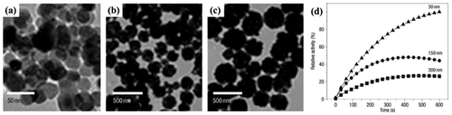 - 57Ma M. Xie J. Zhang Y. Chen Z. P. Gu N. Fe3O4@Pt nanoparticles with enhanced peroxidase-like catalytic activity Mater. Lett. 2013 105 36 3957Fe3O4@Pt nanoparticles with enhanced peroxidase-like catalytic activityMa, Ming; Xie, Jun; Zhang, Yu; Chen, Zhongping; Gu, NingMaterials Letters (2013), 105 (), 36-39CODEN: MLETDJ; ISSN:0167-577X. (Elsevier B.V.)Pt modified Fe3O4 magnetic nanoparticles (Fe3O4@Pt NPs) were synthesized by a simple method. The morphol. and crystal structure of the as-prepd. nanocomposite were characterized by TEM, XRD and EDS. The peroxidase-like catalytic activity of the synthesized nanoparticles was also investigated. Catalysis was found to follow Michaelis-Menten kinetics. The calcd. kinetic parameters of the Fe3O4@Pt NPs show that they exhibited strong affinity with substrates and enhanced catalytic activity than that of Fe3O4 nanoparticles, suggesting a higher peroxidase-like activity.