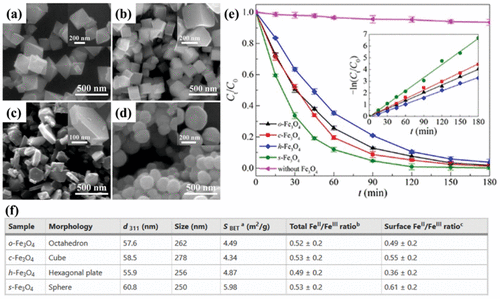 - 119Wan D. Li W. Wang G. Wei X. Shape-Controllable Synthesis of Peroxidase-Like Fe3O4 Nanoparticles for Catalytic Removal of Organic Pollutants J. Mater. Eng. Perform. 2016 25 10 4333 4340119Shape-Controllable Synthesis of Peroxidase-Like Fe3O4 Nanoparticles for Catalytic Removal of Organic PollutantsWan, Dong; Li, Wenbing; Wang, Guanghua; Wei, XiaobiJournal of Materials Engineering and Performance (2016), 25 (10), 4333-4340CODEN: JMEPEG; ISSN:1059-9495. (Springer)The shape of Fe3O4 nanoparticles is controlled using a simple oxidn.-pptn. method without any surfactant. The morphol. and structure of the obtained Fe3O4 nanoparticles were characterized by using x-ray diffraction, SEM, XPS, N2 physisorption and vibrating sample magnetometer. As-prepd. Fe3O4 samples showed octahedron, cube, hexagonal plate and sphere morphologies. Peroxidase-like activity of the four nanostructures was evaluated for catalytic removal of org. pollutants in the presence of H2O2, using rhodamine B as a model compd. The results showed that the H2O2-activating ability of the Fe3O4 nanocrystals was structure dependent and followed the order sphere > cube > octahedron > hexagonal plate, which was closely related to their surface FeII/FeIII ratios or crystal planes. The reusability of Fe3O4 spheres was also investigated after five successive runs, which demonstrated the promising application of the catalyst in the degrdn. of org. pollutants. This investigation is of great significance for the heterogeneous catalysts with enhanced activity and practical application.