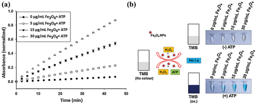 - 62Vallabani N. V. S. Karakoti A. S. Singh S. ATP-mediated intrinsic peroxidase-like activity of Fe3O4-based nanozyme: One step detection of blood glucose at physiological pH Colloids Surf., B 2017 153 52 6062ATP-mediated intrinsic peroxidase-like activity of Fe3O4-based nanozyme: One step detection of blood glucose at physiological pHVallabani, N. V. Srikanth; Karakoti, Ajay S.; Singh, SanjayColloids and Surfaces, B: Biointerfaces (2017), 153 (), 52-60CODEN: CSBBEQ; ISSN:0927-7765. (Elsevier B.V.)Fe3O4 nanoparticles (Fe3O4 NPs), demonstrating peroxidase-like activity has garnered attention in the detection of several biomols., therefore, emerged as an excellent nano-biosensing agent. The intrinsic peroxidase-like activity of Fe3O4 NPs at acidic pH is the fundamental action driving the oxidn. of substrates like TMB, resulting in a colorimetric product formation used in the detection of biomols. Hence, the detection sensitivity essentially depends on the ability of oxidn. by Fe3O4 NPs in presence of H2O2. However, the limited sensitivity and pH condition constraint have been identified as the major drawbacks in the detection of biomols. at physiol. pH. Herein, we report overwhelming of the fundamental limitation of acidic pH and tuning the peroxidase-like activity of Fe3O4 NPs at physiol. pH by using ATP. In presence of ATP, Fe3O4 NPs exhibited enhanced peroxidase-like activity over a wide range of pH and temps. Mechanistically, it was found that the ability of ATP to participate in single electron transfer reaction, through complexation with Fe3O4 NPs, results in the generation of hydroxyl radicals We utilized this ATP-mediated enhanced peroxidase-like activity of Fe3O4 NPs for single step detection of glucose with a colorimetric detection limit of 50μM.