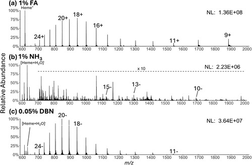 Figure 1. MS1 spectra of solutions containing 10 μM myoglobin and (a) 1% formic acid in positive mode, (b) with 1% NH3·H2O in negative mode, and (c) with 0.05% DBN in negative mode. Selected charge states of the protein and the heme are annotated.