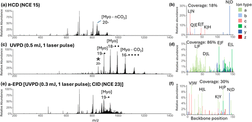 Figure 2. MS/MS spectra of myoglobin (20–, m/z 846, indicated by an asterisk in the UVPD spectrum). (a) HCD using NCE of 15. (c) UVPD using 1 laser pulse of 0.5 mJ. (e) a-EPD performed using UVPD (1 laser pulse of 0.3 mJ) followed by isolation of the charge-reduced 19−• radical ions and then CID using NCE of 23 (b), (d), (f) show sequence coverage and backbone cleavage maps based on relative intensities of fragment ions originating from different backbone cleavage sites derived from the corresponding HCD, UVPD, and a-EPD mass spectra.