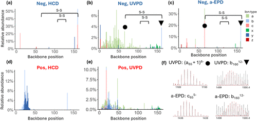 Figure 5. Backbone cleavage maps displaying relative intensities of fragment ions originating from different backbone cleavage sites of β lactoglobulin based on (a) HCD (NCE 14) of 14– charge state, (b) UVPD (1 laser pulse of 1.5 mJ) of 14– charge state, (c) a-EPD of 14– charge state [UVPD (1 laser pulse of 0.5 mJ) followed by isolation of the 13–• radical ions and then CID (NCE 20)], (d) HCD (NCE 14) of the 14+ charge state, and (e) UVPD (1 laser pulse of 1.5 mJ) of 14+ charge state. The backbone cleavage sites adjacent to the C66–C160 disulfide bond that resulted in the most abundant fragment ions are marked with circles and triangles on the backbone cleavage plots for UVPD (5b) and a-EPD (5c). (f) Isotope fitting results of the two of the most abundant fragments originating from cleavage adjacent to C66–C160 disulfide bond produced by UVPD ((a65 + 1)6– and b16012–) and a-EPD (c655– and b16012–) for the 14– charge state (all with score >0.8 in Prosight Native).