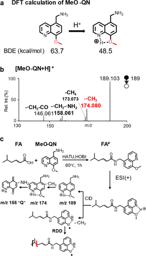 Figure 1. (a) BDE of the C–O bond in MeO-QN before and after protonation. (b) MS2 CID spectrum of [MeO-QN+H]+. (c) Derivatization of FA by MeO-QN and proposed fragmentation pathways of derivatized FA ([FA# + H]+) under CID.