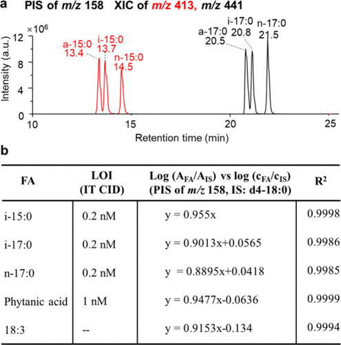 Figure 3. (a) XIC from PIS of m/z 158 for equimolar mixtures of FA 15:0 and FA 17:0 isomers. (b) Calibration curves and limit of identification (LOI) for various fatty acids employing PIS of m/z 158 (IS: FA d4–18:0).