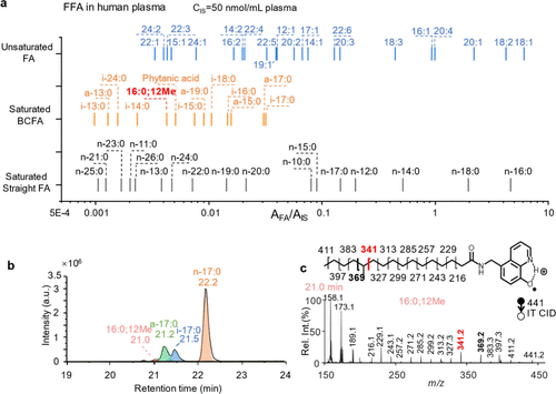 Figure 4. (a) Profiling of FFAs in human plasma (IS: FA 18:0-D4, 50 μ M). (b) XIC of [FA 17:0#+H]+ (m/z 441) in human plasma. (c) Ion trap CID spectrum of [FA 17:0#+H]+ eluted at 21.0 min in panel b.