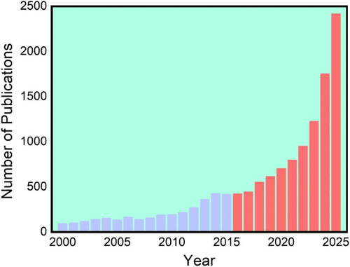 Figure 1. Publication counts retrieved from the Scopus database using the search query: TITLE-ABS-KEY (lithium AND extraction) AND PUBYEAR > 1999 AND PUBYEAR < 2026.