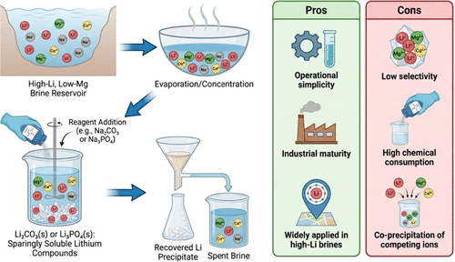 Figure 3. Schematic illustration of lithium recovery via chemical precipitation from high-Li brines, highlighting the process steps, recovered lithium products, and key advantages and limitations of the method.