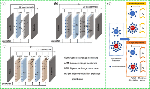 Figure 7. Schematic of (a) traditional electrodialysis, (b) bipolar membrane electrodialysis, and (c) selective electrodialysis adapted with permission from ref (102). Copyright 2024, Elsevier. (d) Changes in the behavior of partially dehydrated ions and membrane pore structure at varying temperatures adapted with permission from ref (103). Copyright 2020, Elsevier.