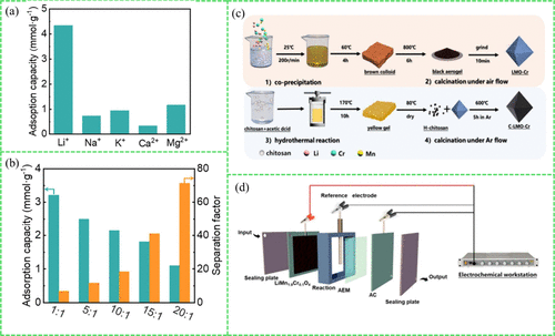 Figure 10. (a) The adsorption capacity in single-salt solutions (0.05 mol/L); (b) separation factor and adsorption capacity across different Mg/Li ratios adapted with permission from ref (109). Copyright 2024, Elsevier. (c) Synthesis process of electrodes; (d) representation of HCDI device adapted with permission from ref (110). Copyright 2024, Elsevier.