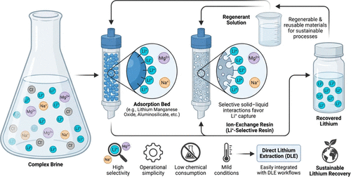 Figure 11. Overview of adsorption and ion-exchange–based direct lithium extraction (DLE) from brines, highlighting selective Li-ion capture, regeneration, and sustainable lithium recovery.