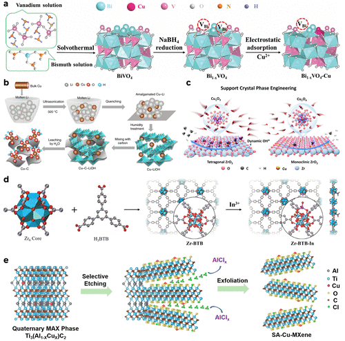 Figure 3. (a) Schematic illustration of preparing Bi1–xVO4–Cu. Reproduced from ref (160). Copyright 2024, Wiley-VCH. (b) Step-by-step preparation of the carbon-supported Cu SA catalyst using an amalgamated Cu–Li method. Reproduced from ref (158). Copyright 2020, Springer Nature. (c) Schematic illustration of the support crystal phase engineering and reaction mechanisms on the surface of Cu1O3-tZrO2 and Cu1O4-mZrO2. Reproduced from ref (83). Copyright 2025, American Chemical Society. (d) Illustration of the synthesis of Zr-BTB-In. Reproduced from ref (154). Copyright 2025, Wiley-VCH. (e) Schematic illustration of the fabrication of SA-Cu-MXene via selective etching of quaternary MAX-Ti3(Al1–xCux)C2. Gray, blue, red, yellow, brown, and green balls represent Al, Ti, Cu, O, C, and Cl atoms, respectively. Reproduced from ref (156). Copyright 2021, American Chemical Society.