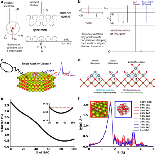 Figure 5. (a) Elastic scattering of electrons from an atomic nucleus, shown schematically (particle model) for a large-angle collision (A) and a 180° collision (B). Sputtering of atoms from the beam-exit surface (C) and the beam-entry surface (D). Reproduced from ref (186). Copyright 2010, Elsevier. (b) Energy-band diagram of a metal (left) and a semiconductor or insulator (right), electron energy being plotted vertically upward. CB and VB represent the conduction and valence bands, f is the work function, Evac, Ef and Eg are the vacuum energy, Fermi energy, and CB-VB energy gap. Upward arrows represent single-electron excitations, while downward arrows are de-excitation processes (filling of a VB or K-shell hole). K-shell excitation in an organic material is shown on the right, with Ekin being the typical kinetic energy of an excited K-shell electron. This process also results in the emission of Auger electrons from the VB, with an energy of about 270 eV. Reproduced from ref (187). Copyright 2013, Elsevier. (c) Schematic diagram of heterogeneous Pt/CeO2 SASCs using EXAFS. (d) Scattering paths for SASCs and small clusters. Schematic depiction of scattering paths present in oxide-supported metal catalysts with a heterogeneity of the metal-site structure including isolated metal sites (middle) as well as metal (left) or oxidized (right) nanoclusters. Bonds are for representation only. Color code: metal (gray), oxygen (red), and support metal cation (brown). (e) R-factor of the 5-path SAC fit to data sets with varying contributions from the Pt/CeO2 SASCs site and metallic Pt13 cluster. The inset shows a zoomed-in region with 70–100% SAC sites (30–0% Pt13 cluster sites). Data are taken over Δk = 3–18 Å–1. (f) Modeled FT EXAFS data for mixtures of the Pt/CeO2 SASCs site and metallic Pt13 cluster. Reproduced from ref (188). Copyright 2023, American Chemical Society.