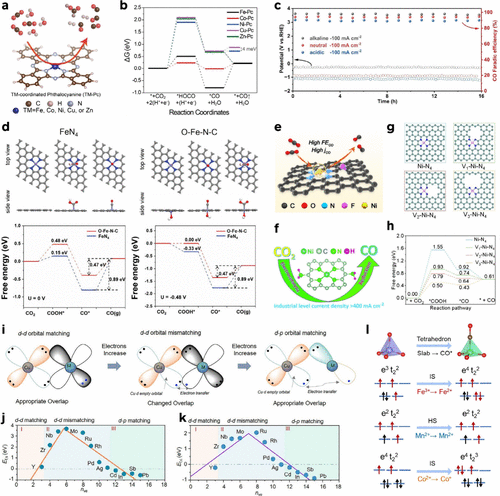 Figure 7. (a) Schematic illustration of CO2RR over a chemical unit of the TM-Pcs. (b) Free energy diagram of TM-PCs for CO2RR at V = 0 V. Reproduced from ref (116). Copyright 2022, American Chemical Society. (c) Stability test of Ni–N3S–C in flow cell with alkaline, acidic, and neutral electrolyte. The electrolytes are 1 M KOH (alkaline, pH = 14), 0.05 M H2SO4 + 1 M KCl (acidic, pH = 1), and 1 M KHCO3 (neutral, pH = 8.2). Reproduced from ref (102). Copyright 2025, Wiley-VCH. (d) Top-left, top-right: Top view and side view optimized adsorption configuration on simulated FeN4 and O–Fe–N-C (Fe, O, N, and C atoms are represented in purple, red, blue, and gray, respectively). Down-left, down-right: Free energy profiles for the CO2RR to CO at 0 V (vs RHE) and at – 0.48 V (vs RHE) on simulated FeN4 and O–Fe–N-C. Reproduced from ref (208). Copyright 2022, Wiley-VCH. (e) Scheme of ECR-to-CO activity for Ni-SAC@NFC. Reproduced from ref (130). Copyright 2024, American Chemical Society. (f) Scheme of ECR-to-CO activity for Ni–N4/C-NH2. Reproduced from ref (209). Copyright 2021, Royal Society Chemistry. (g) Optimized structures of Ni–N4, V1–Ni-N4, V2–Ni-N4, and V3–Ni-N4. (h) Free energy diagram for the ECR-to-CO conversion. Reproduced from ref (81). Copyright 2025, American Chemical Society. (i) Schematic diagram of the orbital matching mechanism, which originated from the characteristic d-d and d-p orbital interactions between the substrate and the dispersed metal atoms. The ″volcano-type″ scaling relationship between the number of valence electrons (nve) of dispersed elements and (j) single atom (k) cluster formation energies. Reproduced from ref (78). Copyright 2025, Wiley-VCH. (l) Different spin states of Co, Fe, and Mn atoms in TM-TCSACs (TM = Co, Fe, and Mn) and CO*. Reproduced from ref (71). Copyright 2025, American Chemical Society.