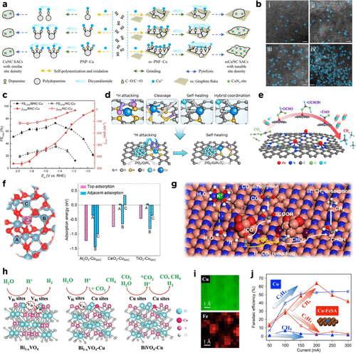 Figure 8. (a) Schematic of the synthesis of CuNC and ssCuNC via support engineering. DCD: Dicyandiamide, PNP-Cu: Cu-chelated polydopamine nanoparticles, ss-PNF-Cu: Cu-bound polydopamine nanoparticles and films coated on ss. (b) AC-HAADF-STEM images of (i) ssCuNC40, (ii) ssCuNC80, (iii) ssCuNC100, and (iv) ssCuNC160. Reproduced from ref (113). Copyright 2025, Springer Nature. (c) FE and partial current densities for CH4 of BNC-Cu and NC-Cu as a function of cathodic potentials. Red curve for partial current density and black curve for methane FE. The error bars of FECH4 and jCH4 are calculated based on three independent measurements. Reproduced from ref (105). Copyright 2023, Springer Nature. (d) Conceptual schematic of the self-healing coordination reconstruction process. Reproduced from ref (212). Copyright 2025, Springer Nature. (e) Scheme of ECR-to-CH4 activity for SA-Zn/MNC. Reproduced from ref (213). Copyright 2020, American Chemical Society. (f) Left: Schematic diagram of CO adjacent-adsorption on the Al2O3–CuSAC surface. Right: CO adsorption energy of Al2O3–CuSAC, CeO2–CuSAC, and TiO2–CuSAC. Reproduced from ref (72). Copyright 2025, Springer Nature. (g) Scheme of ECR-toCH4 activity for SA-Zn/MNC. Reproduced from ref (214). Copyright 2022, American Chemical Society. (h) Diagrams of the electroreduction processes over Bi1–xVO4, Bi1–xVO4–Cu, and BiVO4–Cu. Reproduced from ref (160). Copyright 2023, Wiley-VCH. (i) Atomic elemental mapping using the EELS. (j) Comparison of reaction products for pristine Cu and Cu-FeSA. Error bars represent 1 standard deviation on the basis of three independent samples. Reproduced from ref (215). Copyright 2022, Springer Nature.